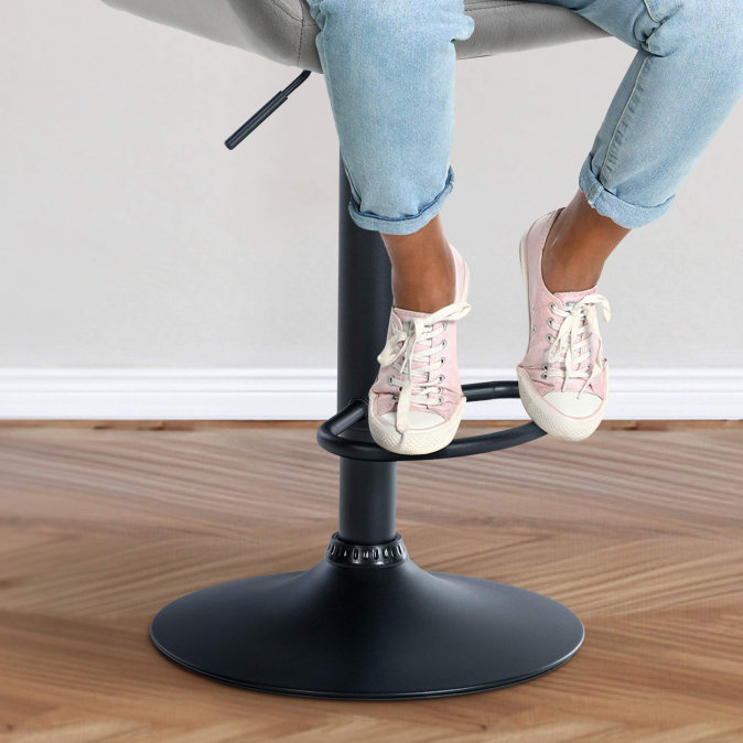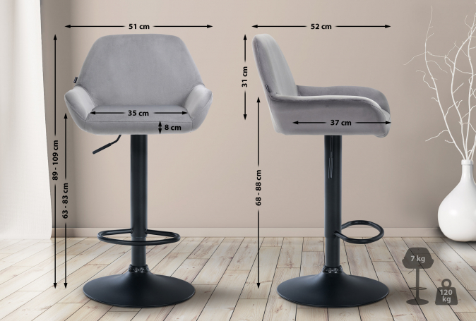 Sedáky a opěradla jsou potaženy sametovými potahy, které se snadno udržují, a díky čalounění nabízejí vysoký komfort sezení. Integrované podnožky podporují vzpřímené sezení. Výšku sedáku lze plynule nastavit pomocí plynových zvedáků. Pro větší flexibilitu lze sedáky otáčet o 360°.