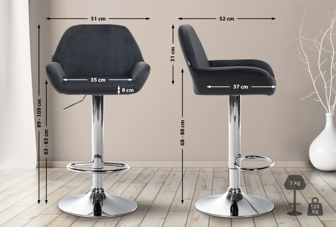 Sedáky a opěradla jsou potaženy sametovými potahy, které se snadno udržují, a díky čalounění nabízejí vysoký komfort sezení. Integrované podnožky podporují vzpřímené sezení. Výšku sedáku lze plynule nastavit pomocí plynových zvedáků. Pro větší flexibilitu lze sedáky otáčet o 360°.