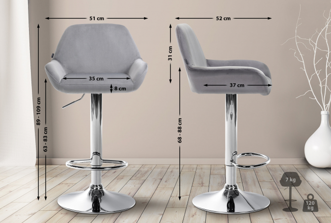 Sedáky a opěradla jsou potaženy sametovými potahy, které se snadno udržují, a díky čalounění nabízejí vysoký komfort sezení. Integrované podnožky podporují vzpřímené sezení. Výšku sedáku lze plynule nastavit pomocí plynových zvedáků. Pro větší flexibilitu lze sedáky otáčet o 360°.