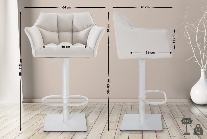 2 ks / set barová židle Deluso látkový potah, bílá, bílá | 88 - 113 cm | Látkový potah | Kov / nerez | 58 - 83 cm | 64 cm | 45 cm | Bílá | 21 Kg | 30 cm | 15 cm | 10 571 Kč