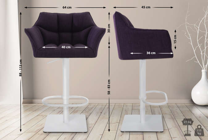 2 ks / set barová židle Deluso látkový potah, bílá, fialová | 88 - 113 cm | Látkový potah | Kov / nerez | 58 - 83 cm | 64 cm | 45 cm | Fialová | 21 Kg | 30 cm | 15 cm | 10 571 Kč