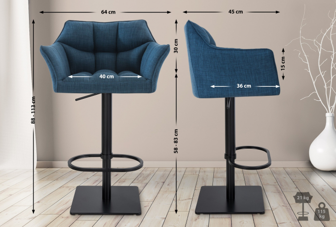 Sada dvou barových židlí Deluso kombinuje eleganci s pohodlím při sezení. Díky čalouněným látkovým potahům jsou stoličky ideální do kuchyně, obývacího pokoje, jídelny i domácího baru.