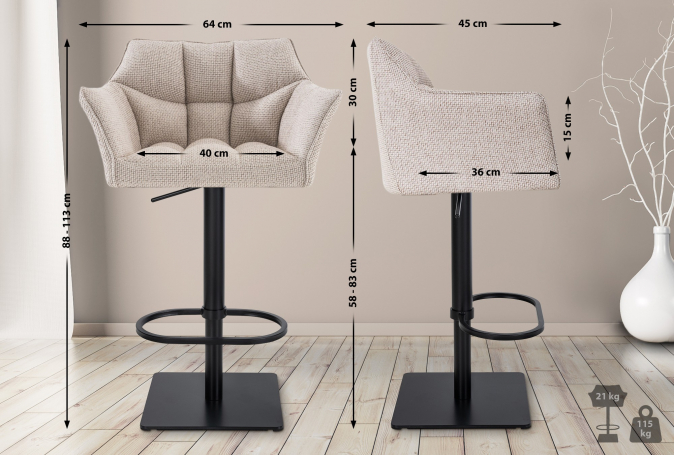 Sada dvou barových židlí Deluso kombinuje eleganci s pohodlím při sezení. Díky čalouněným látkovým potahům jsou stoličky ideální do kuchyně, obývacího pokoje, jídelny i domácího baru.