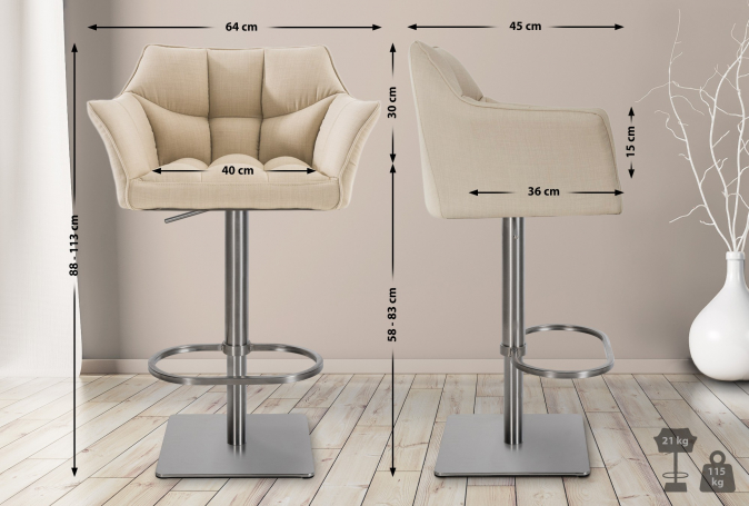 Sada dvou barových židlí Deluso kombinuje eleganci s pohodlím při sezení. Díky čalouněným látkovým potahům jsou stoličky ideální do kuchyně, obývacího pokoje, jídelny i domácího baru.