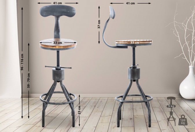 Tuto barovou židli lze díky jejímu stylovému designu používat různými způsoby. Neobvyklý vzhled s tradičními materiály dělá z této barové židle velmi zvláštní poutač pozornosti. Kulatý sedák z borovicového dřeva je útulným místem k posezení. I bez jakéhokoli čalounění nabízí tato barová židle ten nejlepší komfort sezení díky kovovému opěradlu a individuálnímu nastavení výšky. Robustní kovový rám zaručuje maximální stabilitu a pevnost. Celoplošná opěrka nohou poskytuje dodatečné pohodlí.