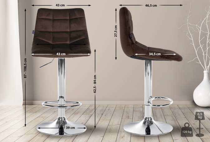 2 ks / set barová židle Jeny samet chrom, hnědá | Hnědá | 4 373 Kč