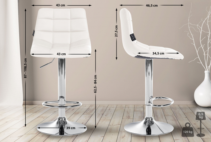 Potah židle je vyroben z měkké umělé kůže a má klasický prošívaný vzor. Robustní kovový rám stoličky je k dispozici v chromové nebo černé barvě a zajišťuje vysokou stabilitu a odolnost. Minimalistický a moderní design taburetu dokonale zapadne do každého interiéru. Kuchyňská stolička se snadno sestavuje a jednoduše čistí. K čištění postačí vlhký bavlněný hadřík, kterým setřete lehké znečištění.