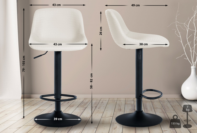 - Trumpetové nohy umožňují otáčení barových židlí o 360°. Každá z nich má také opěrku na nohy, která zajišťuje pohodlné sezení po dlouhou dobu. Černé kovové rámy jsou výškově nastavitelné a nabízejí bezpečný stojan. Rám je navíc vybaven chrániči podlahy, aby nedošlo k jejímu poškrábání.