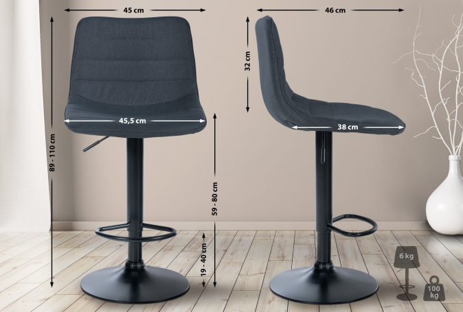 2 ks / set barová židle Louxur látkový potah, černá podnož, tmavě šedá | Tmavě šedá | 4 790 Kč