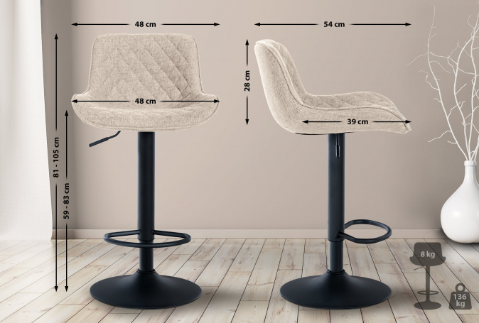 2 ks / set barová židle Luxnos látkový potah, taupe | 81 - 105 cm | Syntetická kůže | 59 -83 cm | 48 cm | 54 cm | Taupe | 8 Kg | 136 Kg | 48 x 39 cm | 28 cm | 3 830 Kč