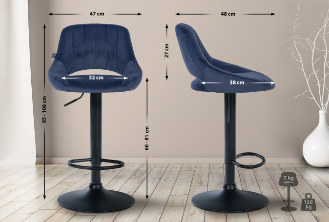 2 ks / set barová židle Mile samet černá podnož, modrá | Modrá | 3 962 Kč