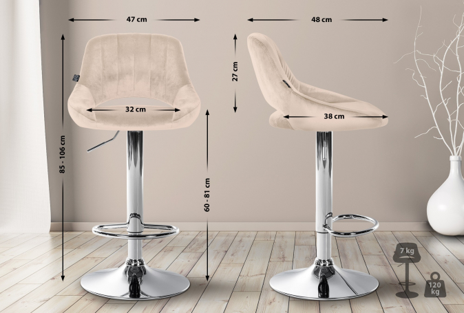 2 ks / set barová židle Mile samet podnož chrom / krémová | Krémová | 4 491 Kč
