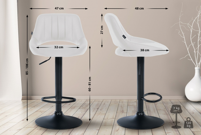 2 ks / set barová židle Mile syntetická kůže, černá podnož, bílá | 85 - 106 cm | Syntetická kůže | 60 - 81 cm | 47 cm | 48 cm | Bílá | 7 Kg | 120 Kg | 32 x 38 cm | 27 cm | 3 830 Kč