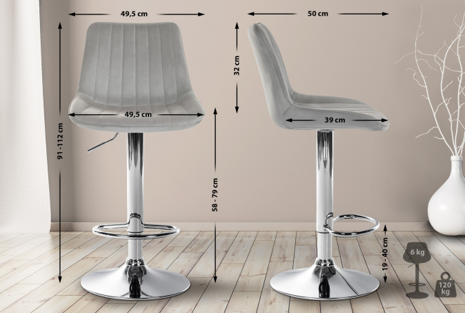 2 ks / set barová židle Toni samet chrom, šedá | 91 - 112 cm | Kov / chrom | 58 - 79 cm | 49.5 cm | 50 cm | Šedá | 6 Kg | 49 x 39 cm | 32 cm | 3 962 Kč