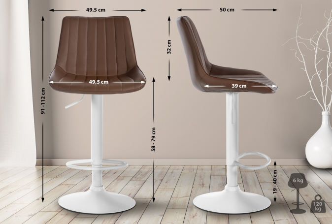2 ks / set barová židle Toni syntetická kůže, bílá, hnědá | 91 - 112 cm | Syntetická kůže | Kov / chrom | 58 - 79 cm | 49.5 cm | 50 cm | Hnědá | 6 Kg | 49 x 39 cm | 32 cm | 3 962 Kč