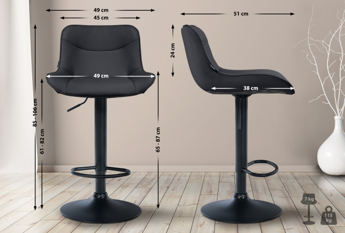 Kovový rám a trubková základna zajišťují stabilitu a odolnost. Integrovaná podnožka se přizpůsobuje výšce sedadla a poskytuje dodatečnou oporu. Sedák z umělé kůže se snadno čistí a je odolný. Chrániče podlahy chrání před poškrábáním.