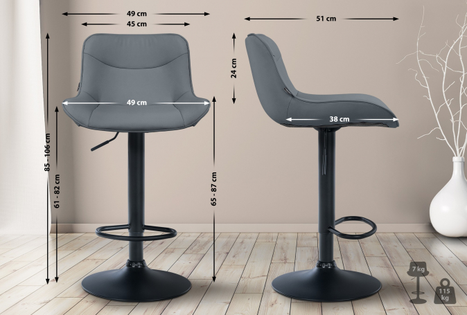 Kovový rám a trubková základna zajišťují stabilitu a odolnost. Integrovaná podnožka se přizpůsobuje výšce sedadla a poskytuje dodatečnou oporu. Sedák z umělé kůže se snadno čistí a je odolný. Chrániče podlahy chrání před poškrábáním.