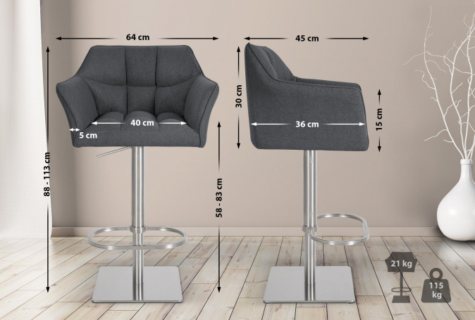 - Barová židle je plynule výškově nastavitelná, takže výšku sedáku lze nastavit v rozmezí 58 až 83 cm.