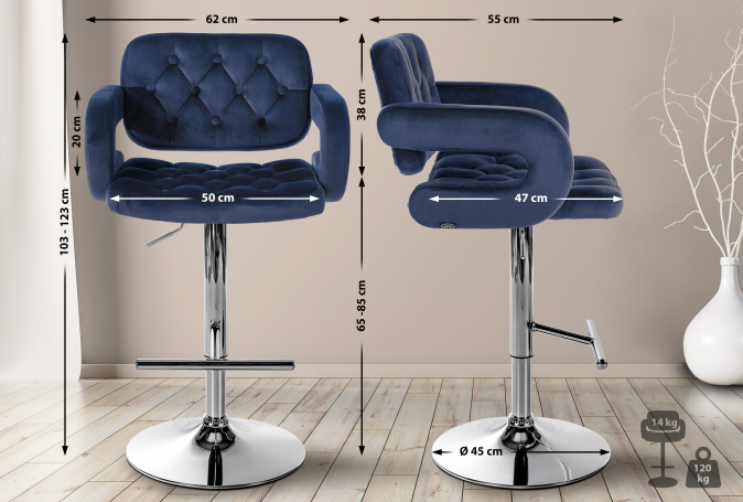 Barová židle Dublin samet chrom, modrá