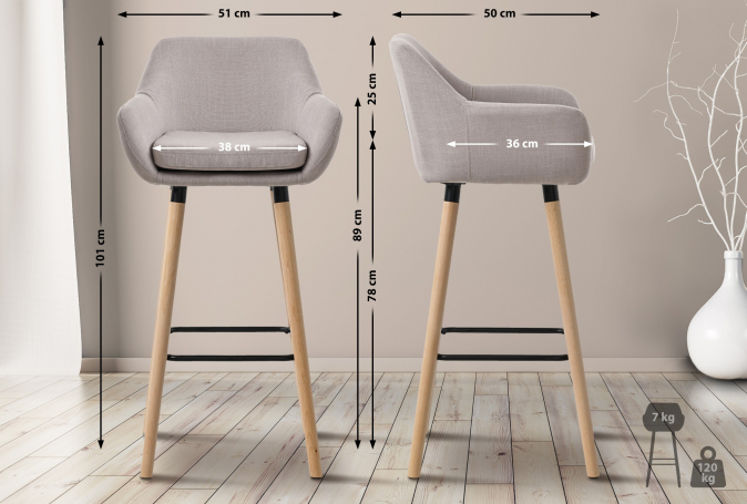 Čtyřnohý rám z robustního bukového dřeva zajišťuje, že barová židle bezpečně stojí a snese zatížení až 150 kilogramů. Díky chráničům podlahy pod nohami židle nedochází k poškození citlivých podlah.