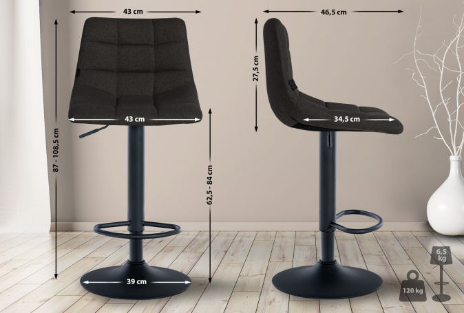 Elegantní a stylová látková barová židle Jeny zaujme nastavitelnou trubkovou základnou a odpovídající podnožkou, která zajišťuje pohodlné sezení. Výšku stoličky lze snadno a rychle nastavit podle vašich potřeb tak, aby se dokonale hodila k vašemu stolu nebo pultu. Barová stolička je také otočná o 360°, takže se můžete volně pohybovat.