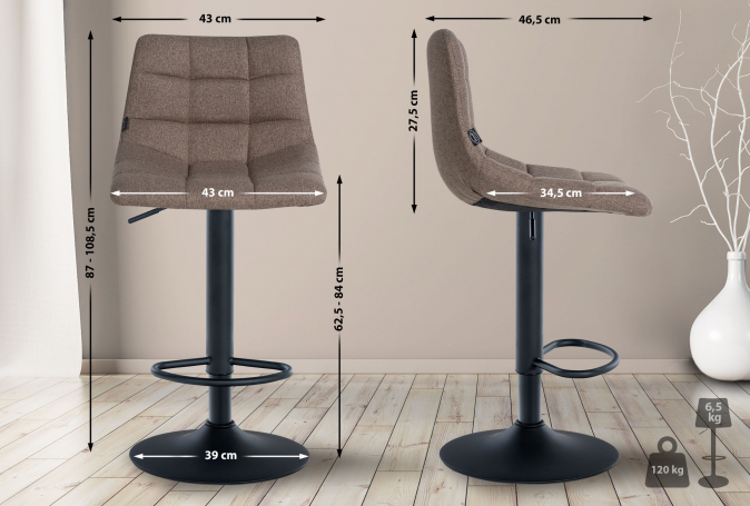 Elegantní a stylová látková barová židle Jeny zaujme nastavitelnou trubkovou základnou a odpovídající podnožkou, která zajišťuje pohodlné sezení. Výšku stoličky lze snadno a rychle nastavit podle vašich potřeb tak, aby se dokonale hodila k vašemu stolu nebo pultu. Barová stolička je také otočná o 360°, takže se můžete volně pohybovat.
