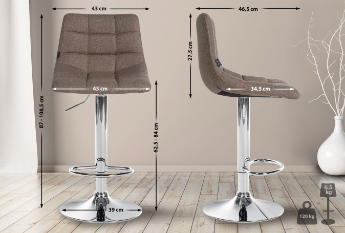 Elegantní a stylová látková barová židle Jeny zaujme nastavitelnou trubkovou podnoží a odpovídající opěrkou nohou, která zajišťuje pohodlné sezení. Výšku stoličky lze snadno a rychle nastavit podle vašich potřeb tak, aby se dokonale hodila k vašemu stolu nebo pultu. Barová stolička je také otočná o 360°, takže se můžete volně pohybovat.