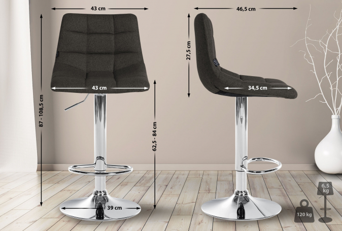 Elegantní a stylová látková barová židle Jeny zaujme nastavitelnou trubkovou podnoží a odpovídající opěrkou nohou, která zajišťuje pohodlné sezení. Výšku stoličky lze snadno a rychle nastavit podle vašich potřeb tak, aby se dokonale hodila k vašemu stolu nebo pultu. Barová stolička je také otočná o 360°, takže se můžete volně pohybovat.