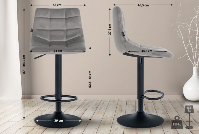 Stoličky je vyroben z měkkého sametu a má klasický prošívaný vzor. Elegantní a nadčasový vzhled barové stoličky podtrhuje sametový potah v různých barvách. Robustní kovový rám taburetu je k dispozici v chromové nebo černé barvě a zajišťuje vysokou stabilitu a odolnost. Minimalistický a moderní design stoličky se bez problémů hodí do každého interiéru.