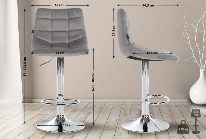 Potah židle je vyroben z měkkého sametu a má klasický prošívaný vzor. Elegantní a nadčasový vzhled barové stoličky podtrhuje sametový potah v různých barvách. Robustní kovový rám taburetu je k dispozici v chromové nebo černé barvě a zajišťuje vysokou stabilitu a odolnost. Minimalistický a moderní design stoličky se bez problémů hodí do každého interiéru.