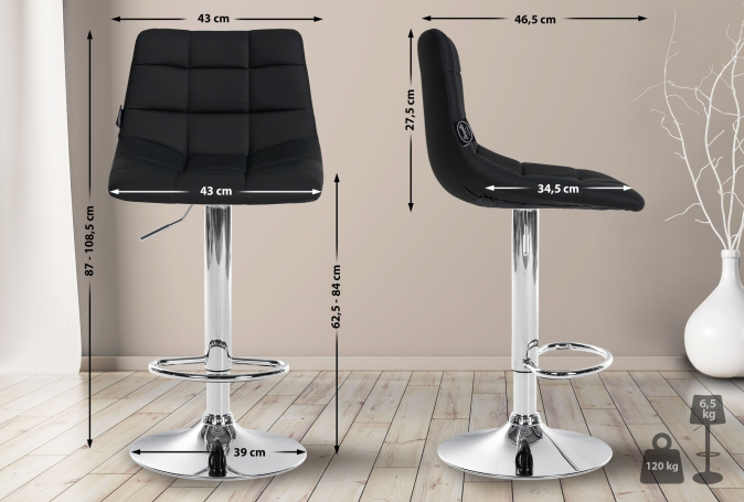 Potah stoličky je vyroben z měkké umělé kůže a má klasický prošívaný vzor. Elegantní a nadčasový vzhled barové stoličky podtrhuje potah z umělé kůže v různých barvách. Robustní kovový rám stoličky je k dispozici v chromové nebo černé barvě a zajišťuje vysokou stabilitu a odolnost. Minimalistický a moderní design stoličky se bez problémů hodí do každého interiéru.