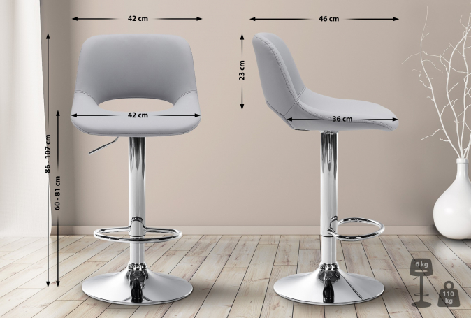 Barová židle je ideální pro dlouhé sezení s maximální pohodlím a volností pohybu. Díky výškově nastavitelnému sedadlu a otočné funkci je vhodná pro různé prostředí. Celkové rozměry židle jsou: výška 86 - 107 cm, šířka 42 cm, hloubka 46 cm, výška sedu 60 - 81 cm, plocha sedu 42 x 36 cm, výška opěradla 23 cm. Maximální nosnost židle je 110 kg a váží 6 kg. Složení materiálu je 100 % polyuretan.