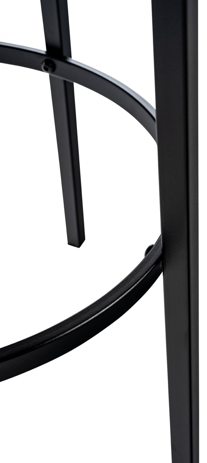 Barová židle Kamari zaujme nadčasovou kombinací kulatého čalouněného sedáku a matně černého kovového rámu na čtyřech nohách.