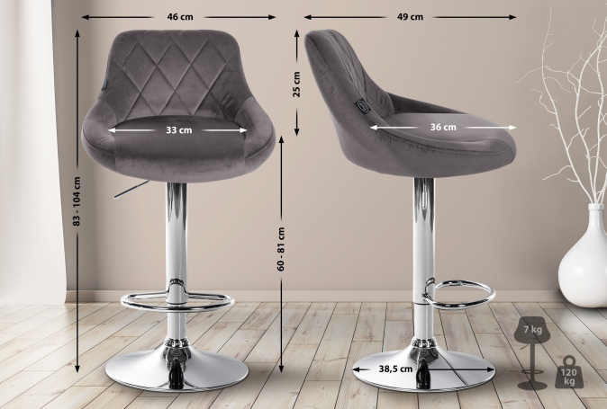Barová židle Lazio samet chrom, tmavě šedá | Tmavě šedá | 3 122 Kč