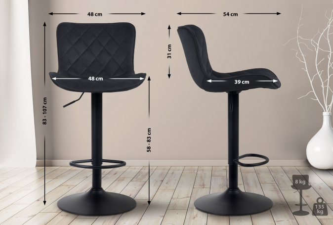 Trubková základna umožňuje otáčení sedáku o 360°. Kromě toho je barová židle výškově nastavitelná a díky stabilní základně nabízí bezpečné postavení.
