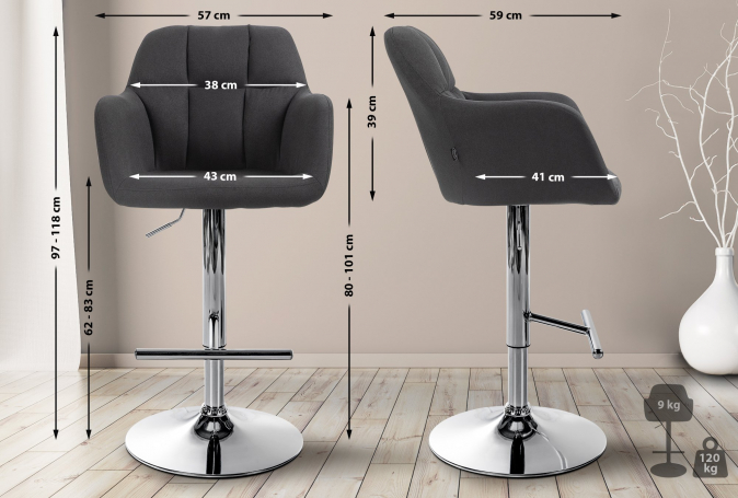 Látková barová židle Omaha se vyznačuje funkčním designem a pohodlím při sezení. Díky možnosti nastavení výšky od 97 do 118 cm a šířce 57 cm a hloubce 59 cm ji lze přizpůsobit široké škále výšek pultů. Sedák a opěrák o rozměrech 43 x 41 cm jsou navrženy tak, aby poskytovaly oporu a pohodlí. Funkčnost zvyšují područky a opěrka nohou na trubkové základně, zatímco chránič podlahy zabraňuje poškození povrchu. Barová židle Omaha s hmotností 9 kg a nosností až 120 kg představuje robustní sedadlo. Funkce otočná o 360° navíc podporuje mobilitu a flexibilitu.