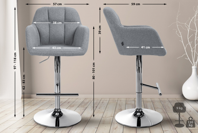 Látková barová židle Omaha se vyznačuje funkčním designem a pohodlím při sezení. Díky možnosti nastavení výšky od 97 do 118 cm a šířce 57 cm a hloubce 59 cm ji lze přizpůsobit široké škále výšek pultů. Sedák a opěrák o rozměrech 43 x 41 cm jsou navrženy tak, aby poskytovaly oporu a pohodlí. Funkčnost zvyšují područky a opěrka nohou na trubkové základně, zatímco chránič podlahy zabraňuje poškození povrchu. Barová židle Omaha s hmotností 9 kg a nosností až 120 kg představuje robustní sedadlo. Funkce otočná o 360° navíc podporuje mobilitu a flexibilitu.