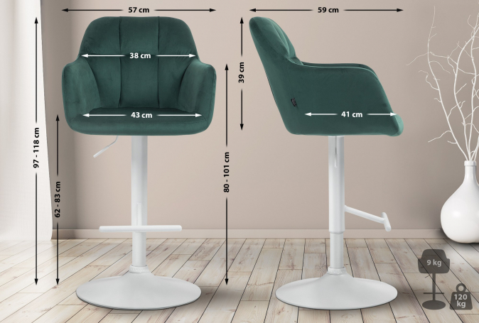 Sametová barová židle Omaha se vyznačuje funkčním designem a pohodlím při sezení. Nastavitelná výška od 97 do 118 cm, stejně jako šířka 57 cm a hloubka 59 cm umožňují přizpůsobení široké škále výšek pultů. Sedák a opěrák o rozměrech 43 x 41 cm jsou navrženy tak, aby poskytovaly oporu a pohodlí. Funkčnost zvyšují područky a opěrka nohou na trubkové základně, zatímco chránič podlahy zabraňuje poškození povrchu. Barová židle Omaha s hmotností 9 kg a nosností až 120 kg představuje robustní sedadlo. Funkce otáčení o 360° navíc podporuje mobilitu a flexibilitu.