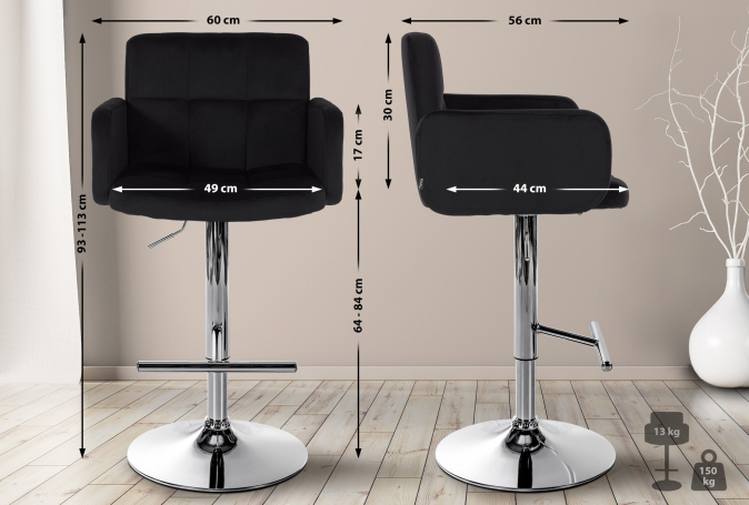 Barová židle Pompe samet chrom, černá | Černá | 4 790 Kč