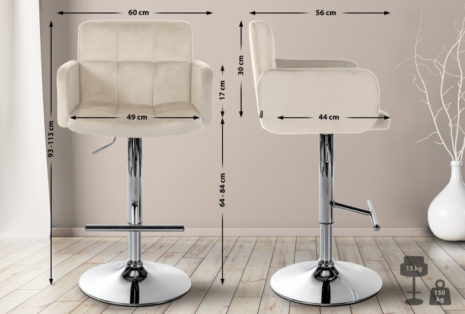 Barová židle Pompe samet chrom, krémová | Krémová | 5 290 Kč