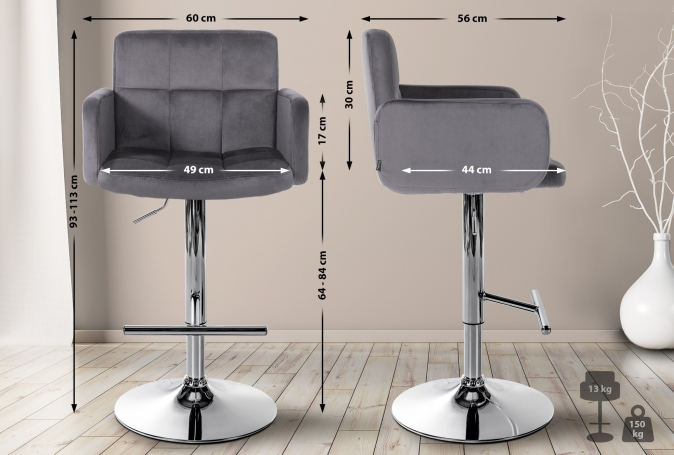 Barová židle Pompe samet chrom, tmavě šedá | Tmavě šedá | 5 290 Kč