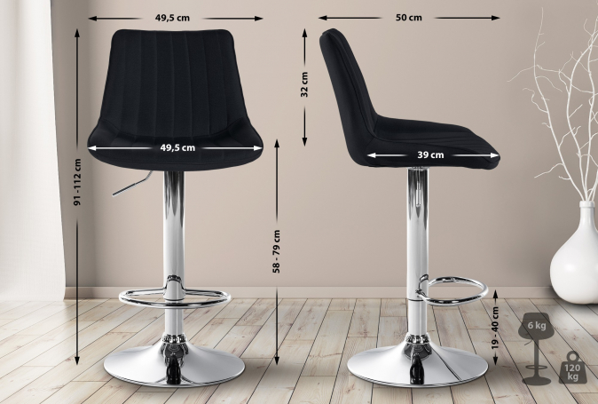 Barová židle Toni látkový potah, chrom, černá | Černá | 3 289 Kč