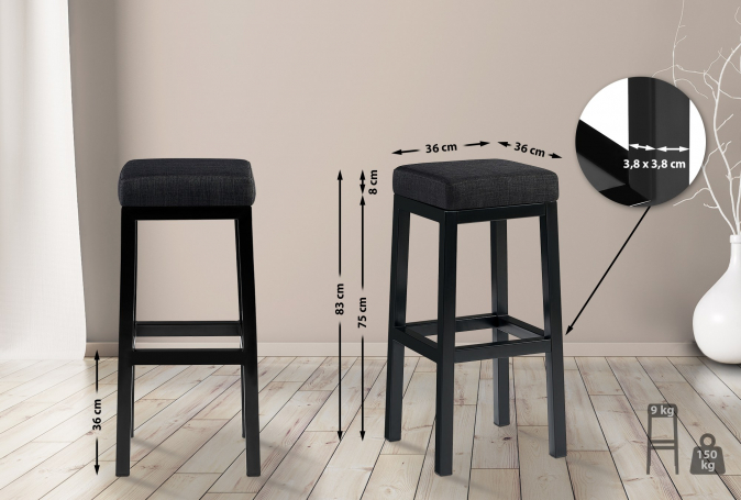 - Taburet stojí na robustním čtyřnohém rámu z matného černého kovu. Tento rám je mimořádně stabilní a šetrný k podlaze, takže nepoškodí citlivé podlahy. Příčné vzpěry rámu lze použít jako pohodlnou opěrku nohou a zajišťují dodatečnou stabilitu, takže barová stolička unese až 150 kg.