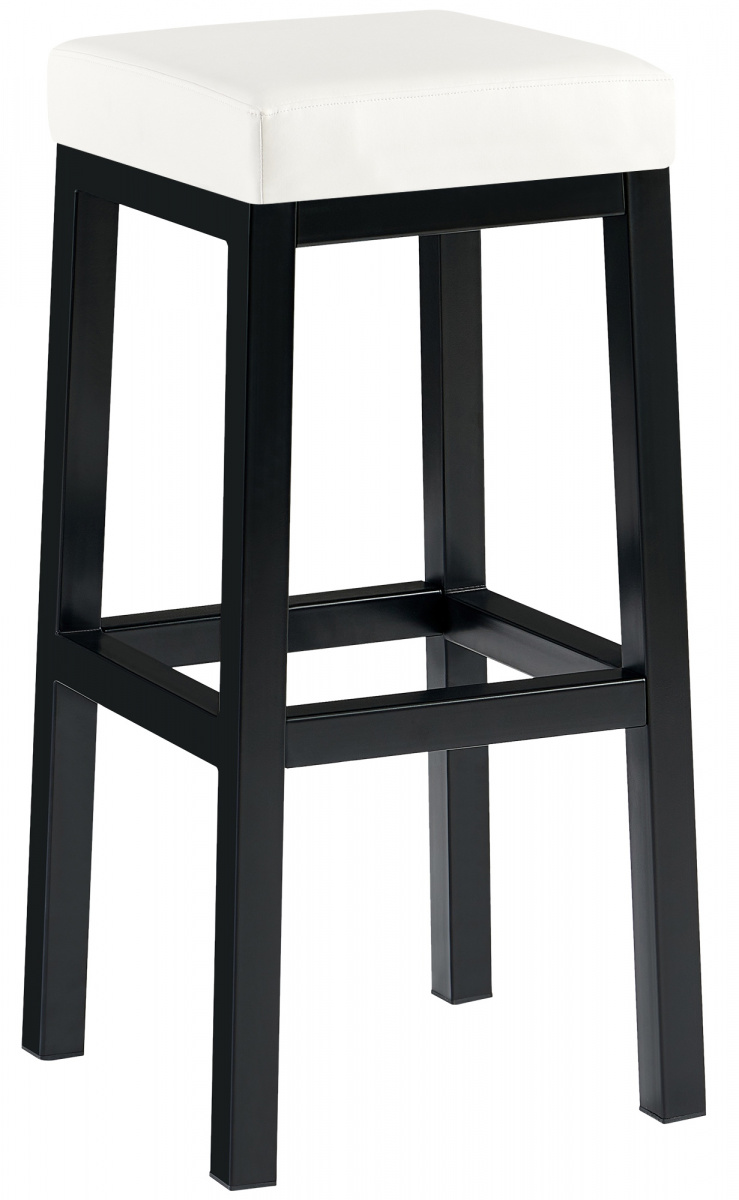 Čtvercový sedák barové židle je pohodlný i bez područek a opěradla. To zajišťuje čalounění, které je na přání potaženo látkou nebo umělou kůží.