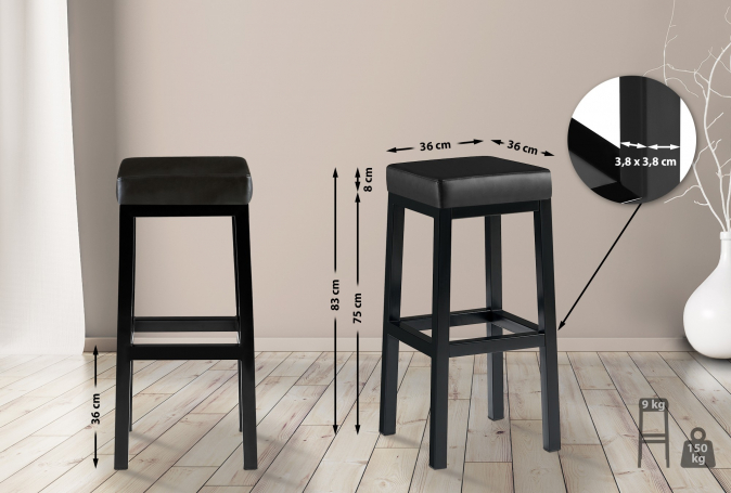 Taburet stojí na robustním čtyřnohém rámu z matného černého kovu. Tento rám je mimořádně stabilní a šetrný k podlaze, takže nepoškodí citlivé podlahy. Příčné vzpěry rámu lze použít jako pohodlnou opěrku nohou a zajišťují dodatečnou stabilitu, takže barová stolička unese až 150 kg.