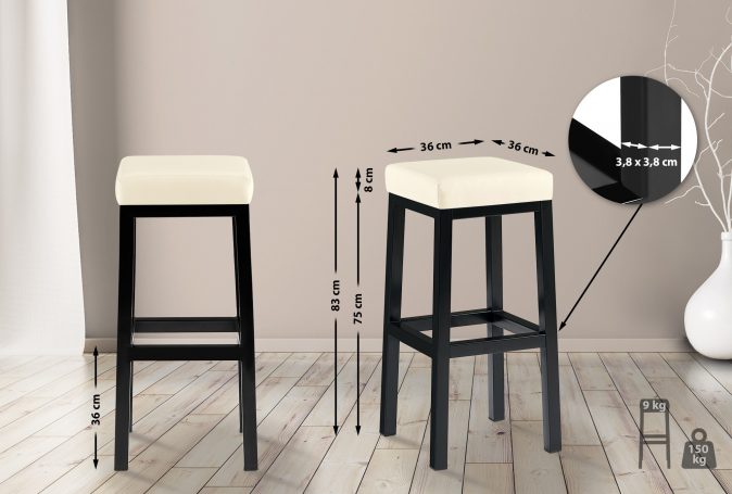 Taburet stojí na robustním čtyřnohém rámu z matného černého kovu. Tento rám je mimořádně stabilní a šetrný k podlaze, takže nepoškodí citlivé podlahy. Příčné vzpěry rámu lze použít jako pohodlnou opěrku nohou a zajišťují dodatečnou stabilitu, takže barová stolička unese až 150 kg.