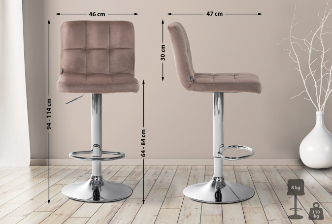 Sametová barová židle Veru je stylovou kombinací pohodlí a moderního designu, která je ideální pro obývací a barové prostory. Nabízí luxusně čalouněný sedák z prošívaného sametu, který zaručuje vynikající pohodlí. Jeho výšková nastavitelnost a možnost otáčení o 360 stupňů umožňuje flexibilní možnosti využití, zatímco robustní kovová základna zajišťuje stabilitu. Praktická opěrka nohou podporuje pohodlné sezení a dále zvyšuje komfort. Díky snadné montáži a designu šetrnému k podlaze se sametová barová židle Veru stane nepostradatelným prvkem každého moderního interiéru.