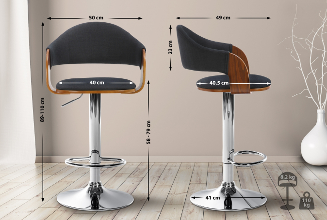 Barní stoličku lze snadno výškově nastavit a otočit o 360 stupňů, takže je ideální pro nalezení ideální polohy k sezení. Pro větší pohodlí má barová židle integrovanou opěrku nohou, která podporuje pohodlné a vzpřímené sezení.