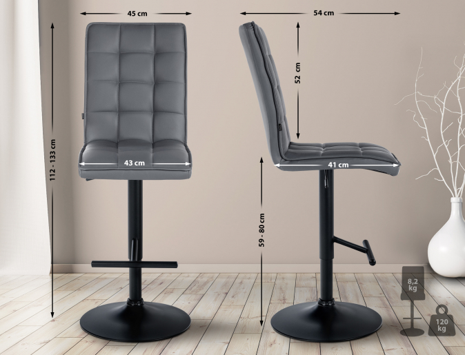 Tento model má robustní trubkovou základnu a opěrku nohou pro bezpečné a pohodlné sezení. Výšku sedáku lze individuálně nastavit pomocí páčky na pravé spodní straně sedáku. Díky svému modernímu designu se skvěle hodí do každého obývacího pokoje, jídelny nebo kuchyně.