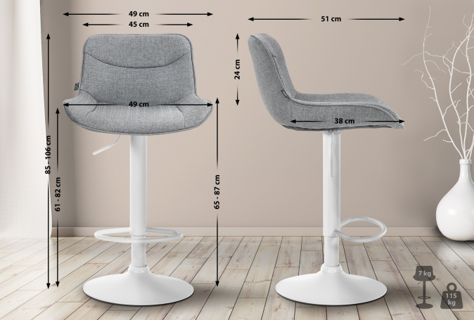 Látková barová židle Voronei v sobě spojuje funkčnost a moderní design. Výškově nastavitelná barová židle nabízí čalouněný sedák a ergonomický tvar pro optimální pohodlí. Funkce otočná o 360° a plynulé nastavení výšky umožňují flexibilní polohy sezení.